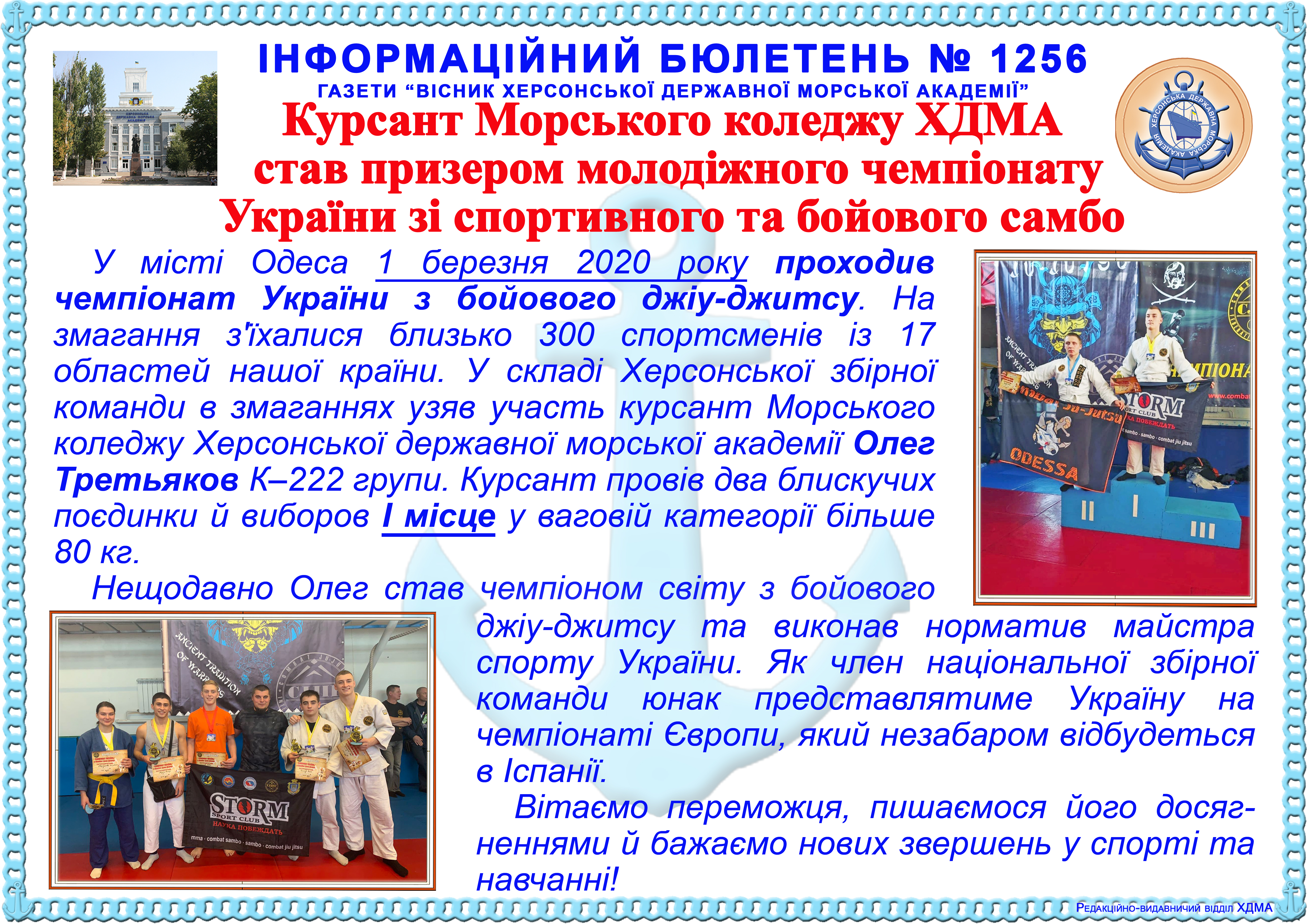 Інформаційний бюлетень № 1256 Курсант Морського коледжу Херсонської державної морської академії – чемпіон України