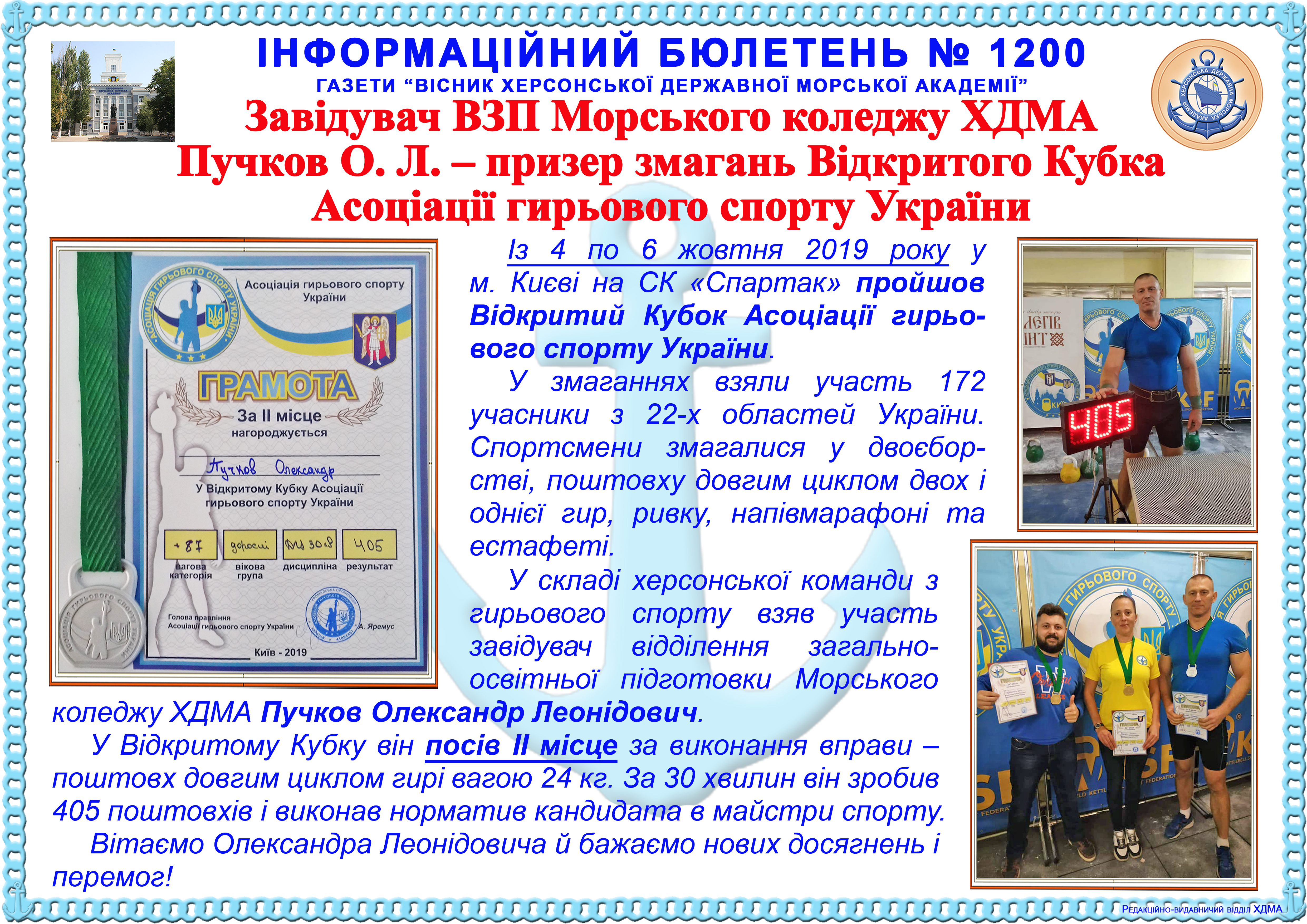 Інформаційний бюлетень № 1200 Завідувач ВЗП Морського коледжу ХДМА Пучков О. Л. – призер змагань Відкритого Кубка Асоціації гирьового спорту України