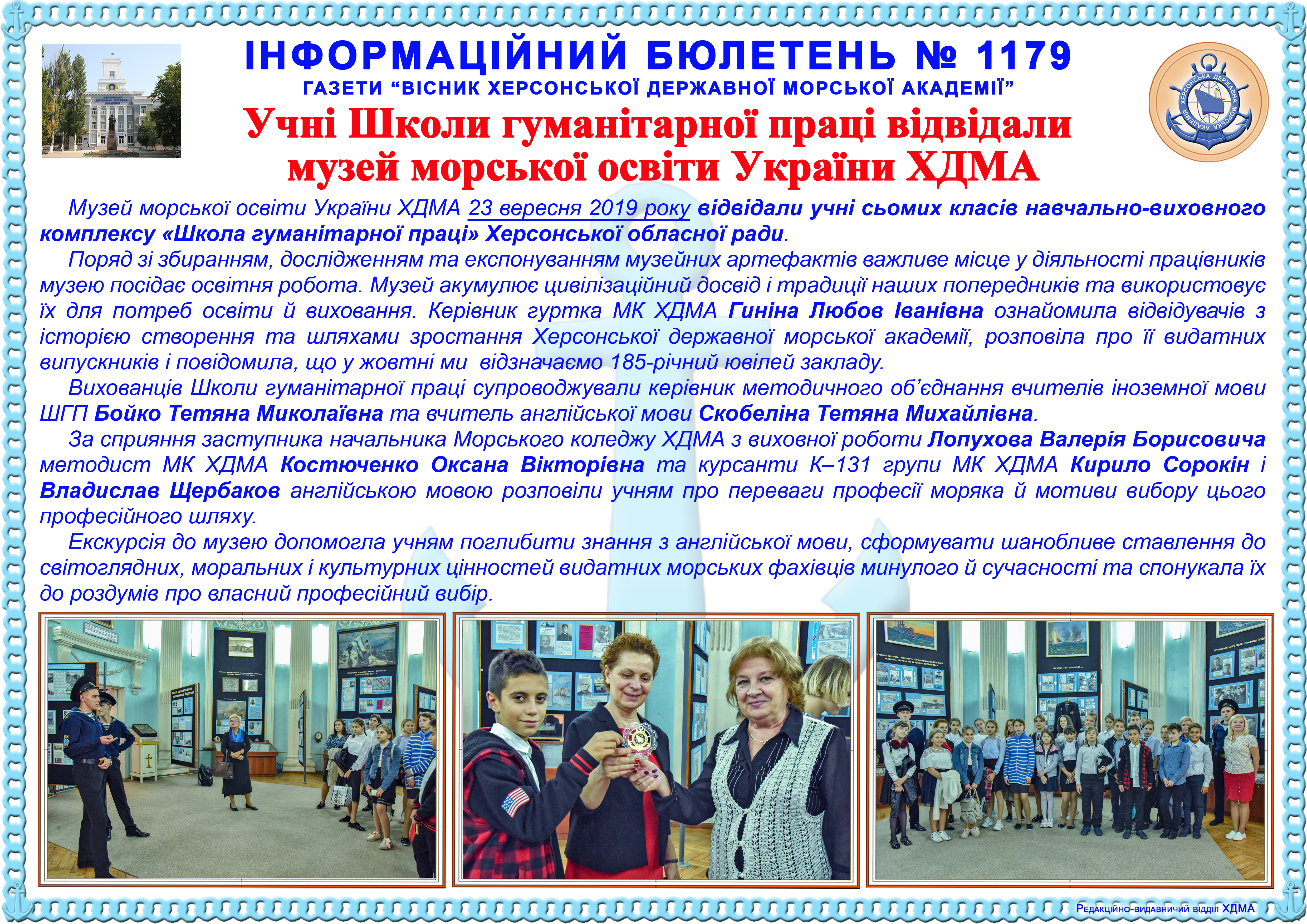 Інформаційний бюлетень № 1179 Учні Школи гуманітарної праці відвідали музей морської освіти України ХДМА