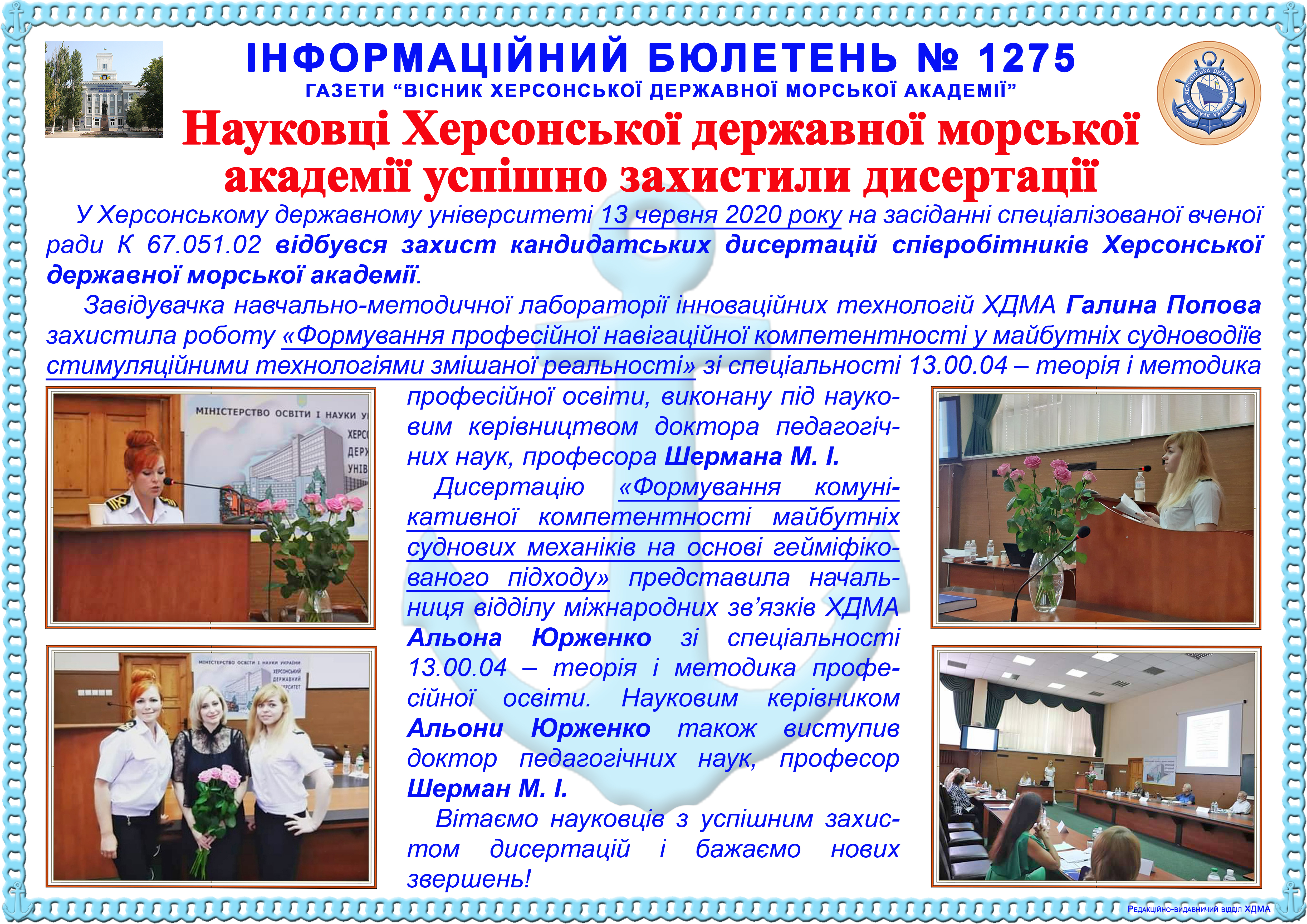 Інформаційний бюлетень № 1275 Науковці Херсонської державної морської академії успішно захистили дисертації