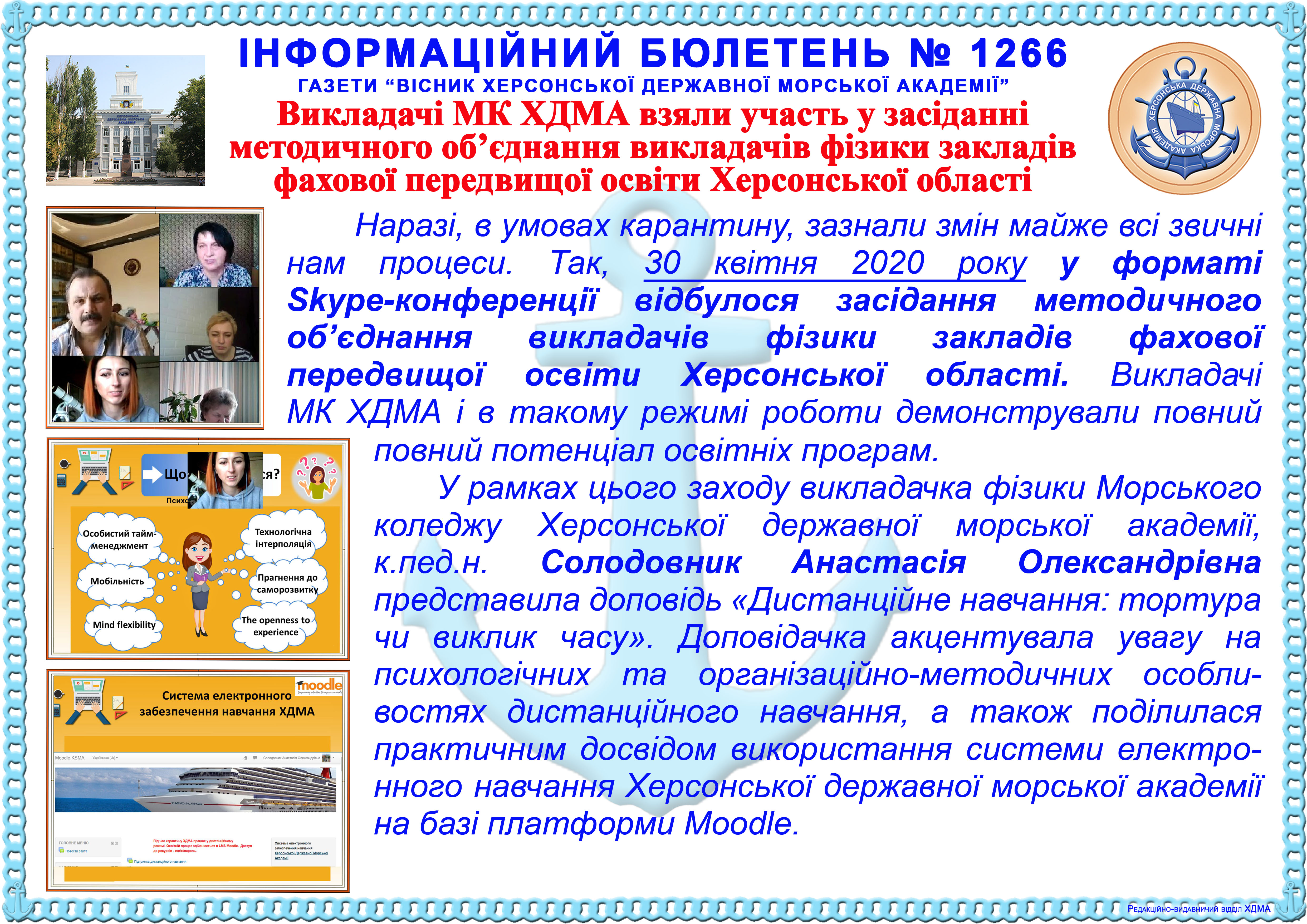 Інформаційний бюлетень № 1266 Викладачі МК ХДМА взяли участь у засіданні методичного об’єднання викладачів фізики закладів фахової передвищої освіти Херсонської області