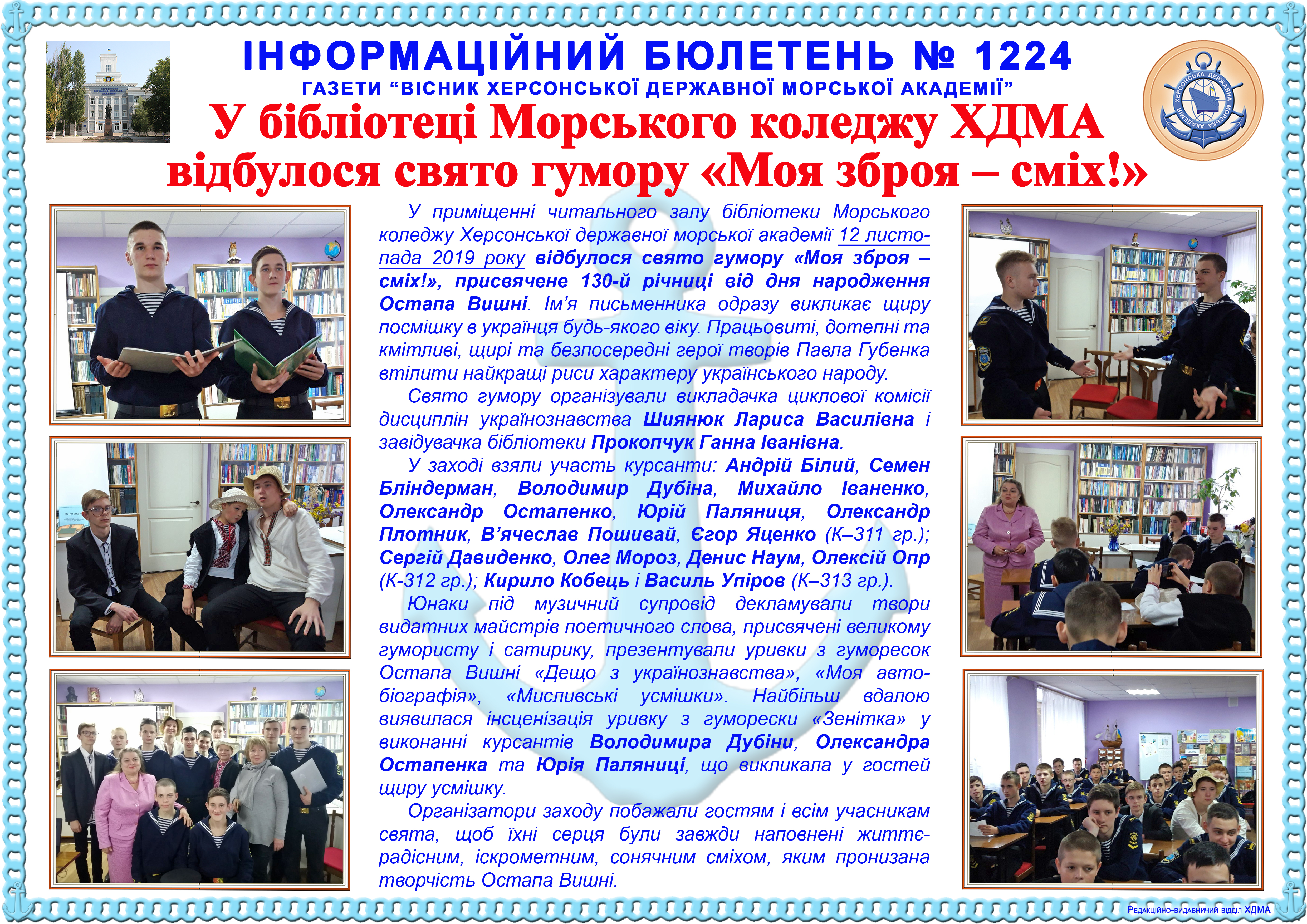 Інформаційний бюлетень № 1224 У бібліотеці Морського коледжу Херсонської державної морської акдемії відбулося свято гумору «Моя зброя – сміх!»