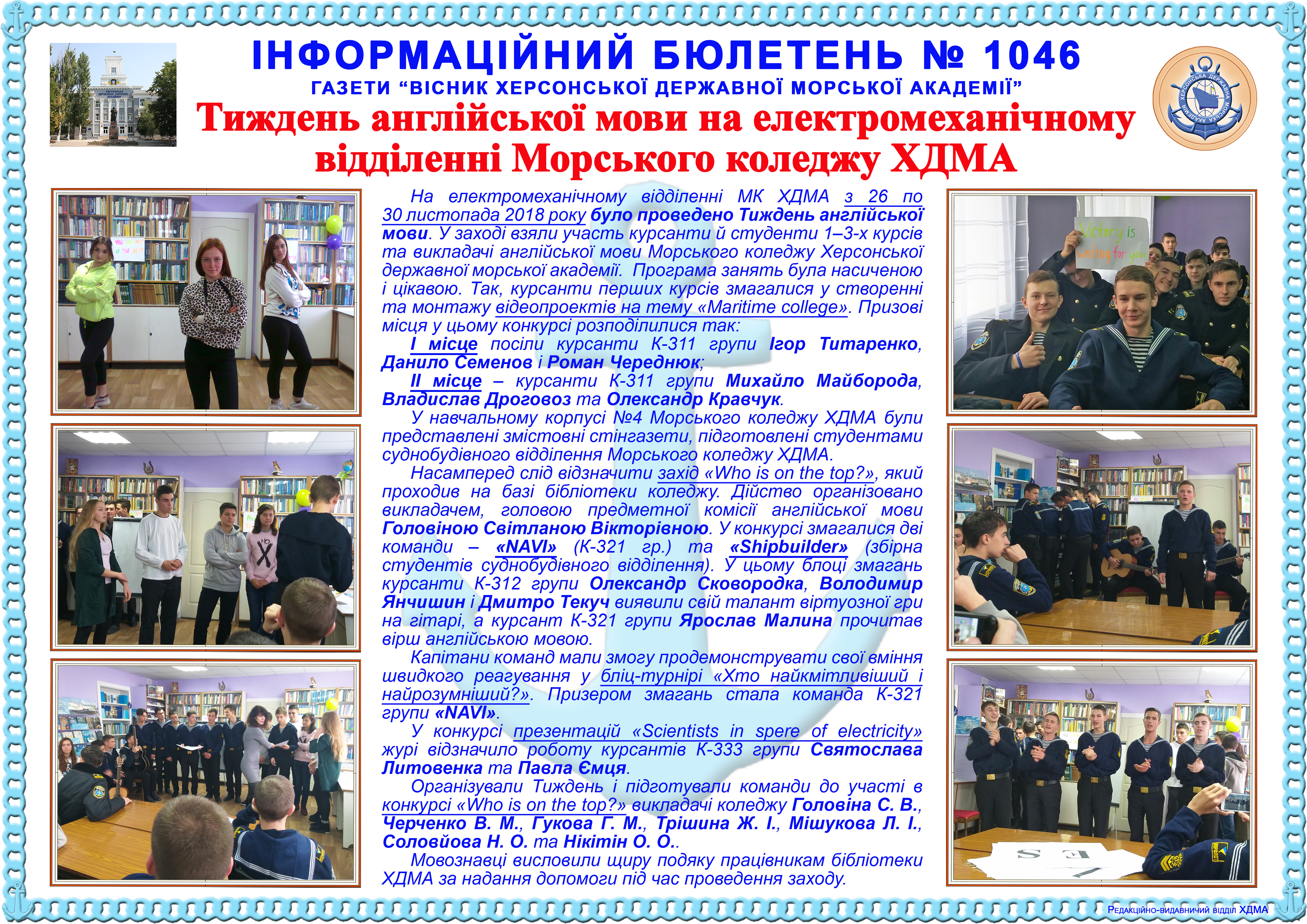 Інформаційний бюлетень № 1046 Тиждень англійської мови на електромеханічному відділенні Морського коледжу ХДМА
