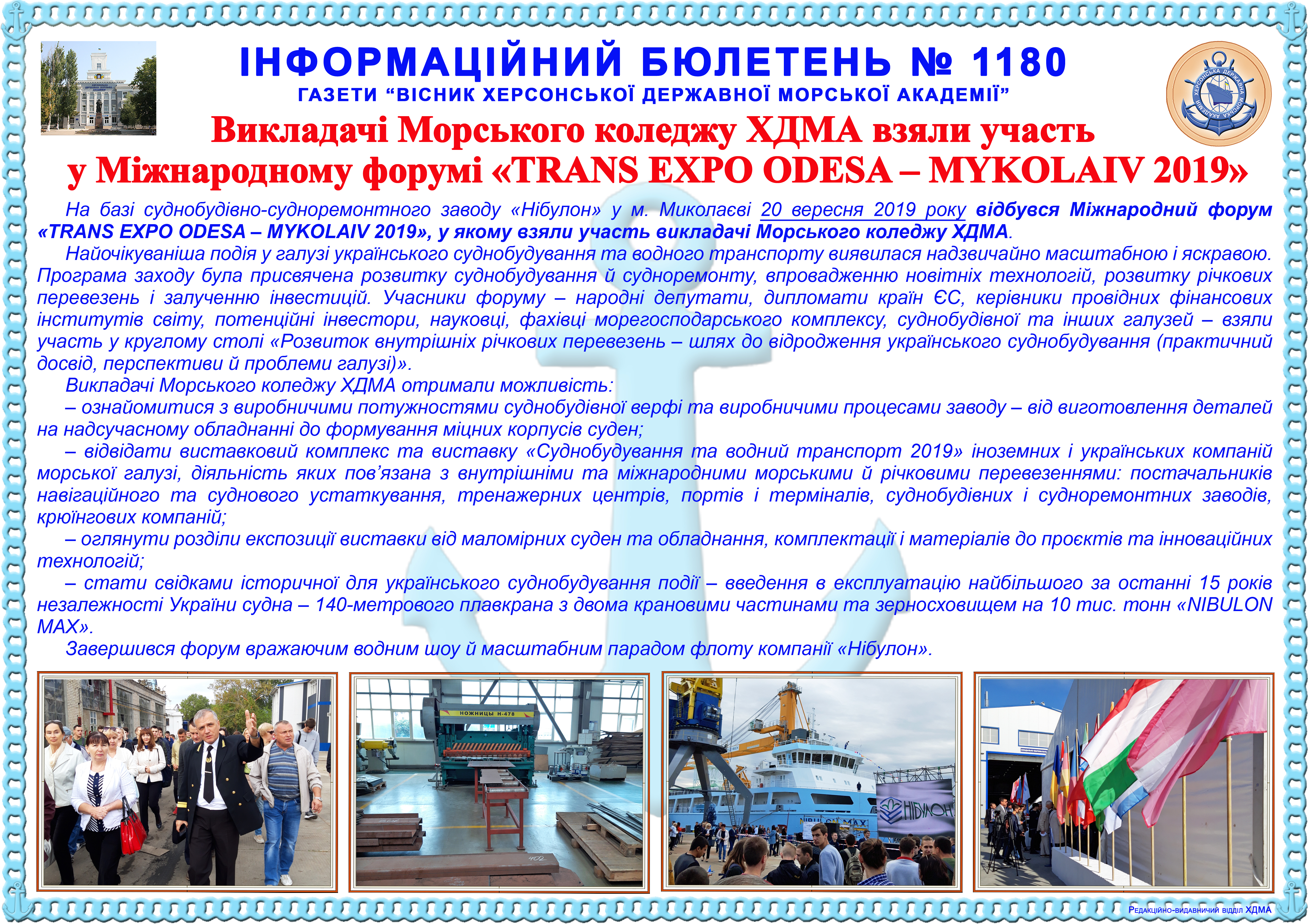 Інформаційний бюлетень № 1180 Викладачі Морського коледжу ХДМА взяли участь у Міжнародному форумі «TRANS EXPO ODESA – MYKOLAIV 2019»