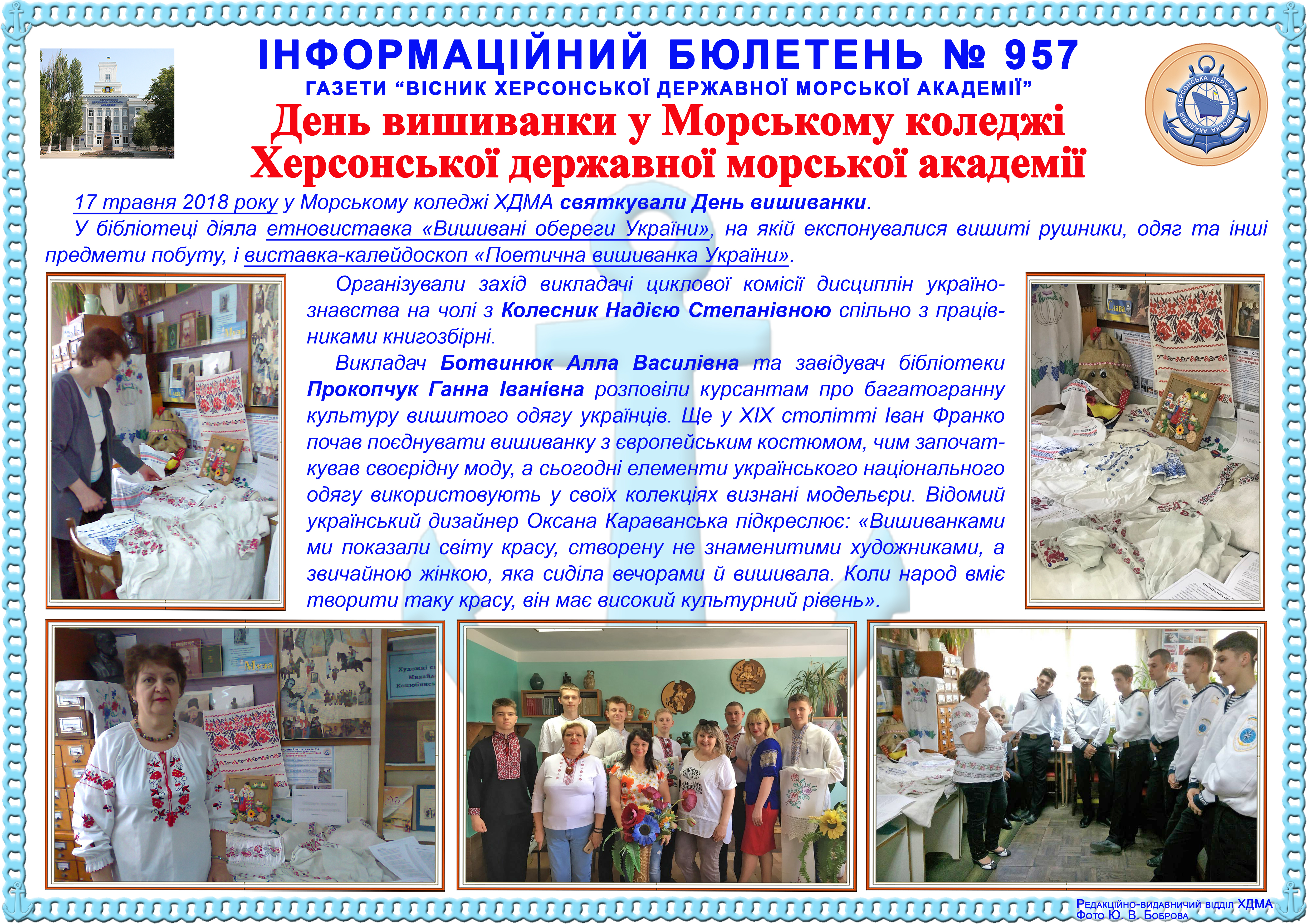 Інформаційний бюлетень № 957 День вишиванки у Морському коледжі Херсонської державної морської академії