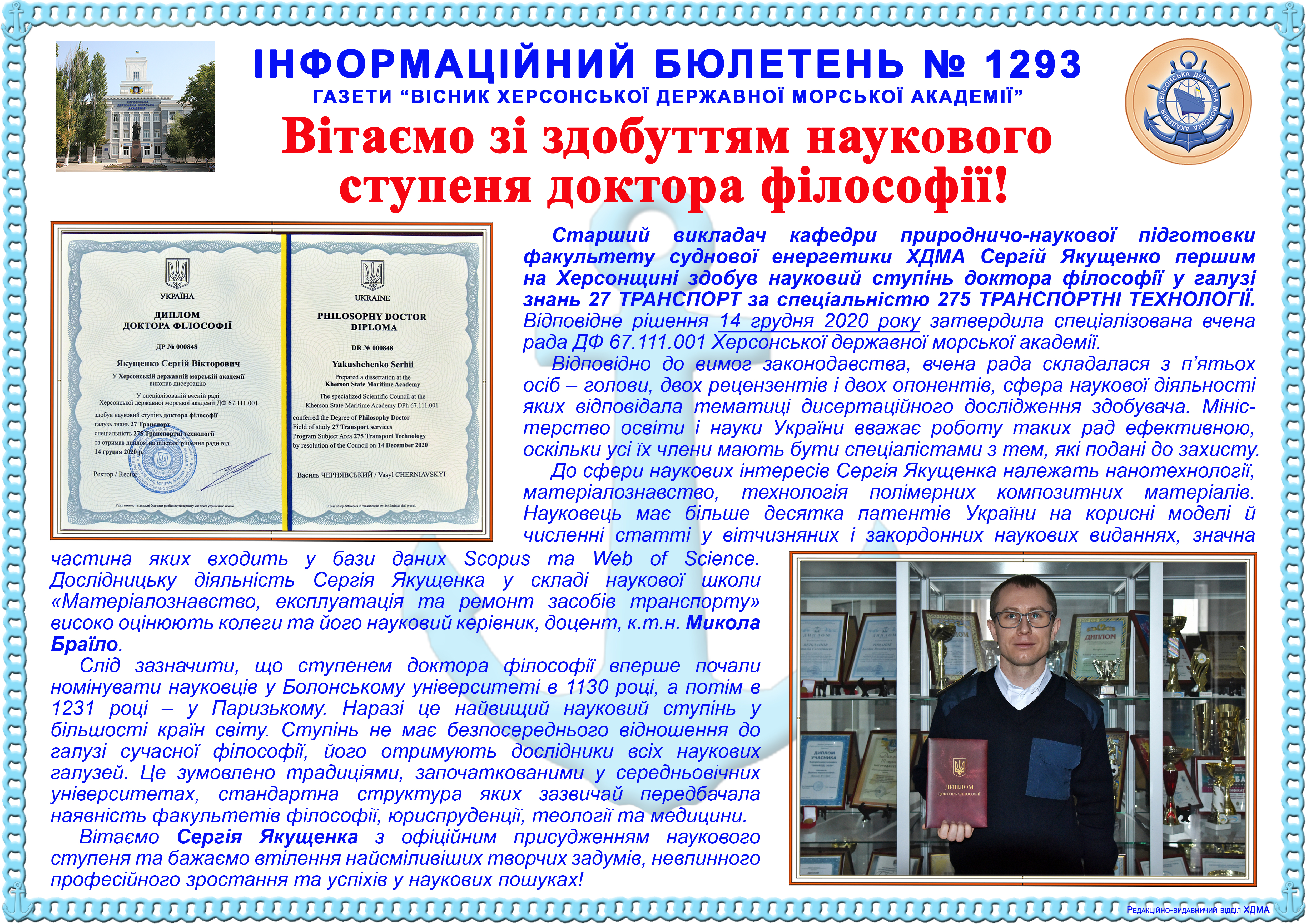 Інформаційний бюлетень № 1293 Вітаємо зі здобуттям наукового ступеня доктора філософії!