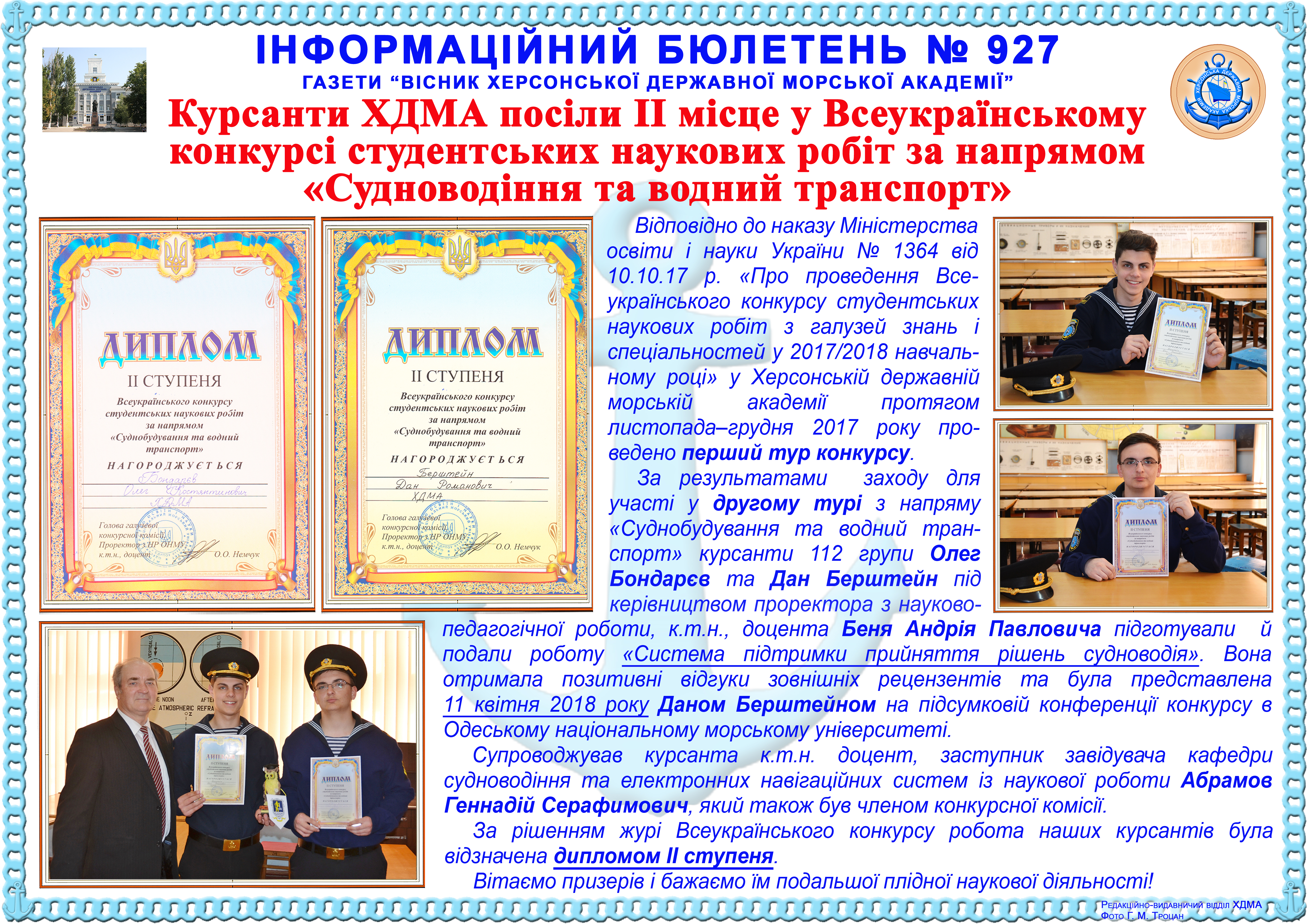 Інформаційний бюлетень № 927 Курсанти ХДМА посіли ІІ місце у Всеукраїнському конкурсі студентських наукових робіт за напрямом «Судноводіння та водний транспорт»