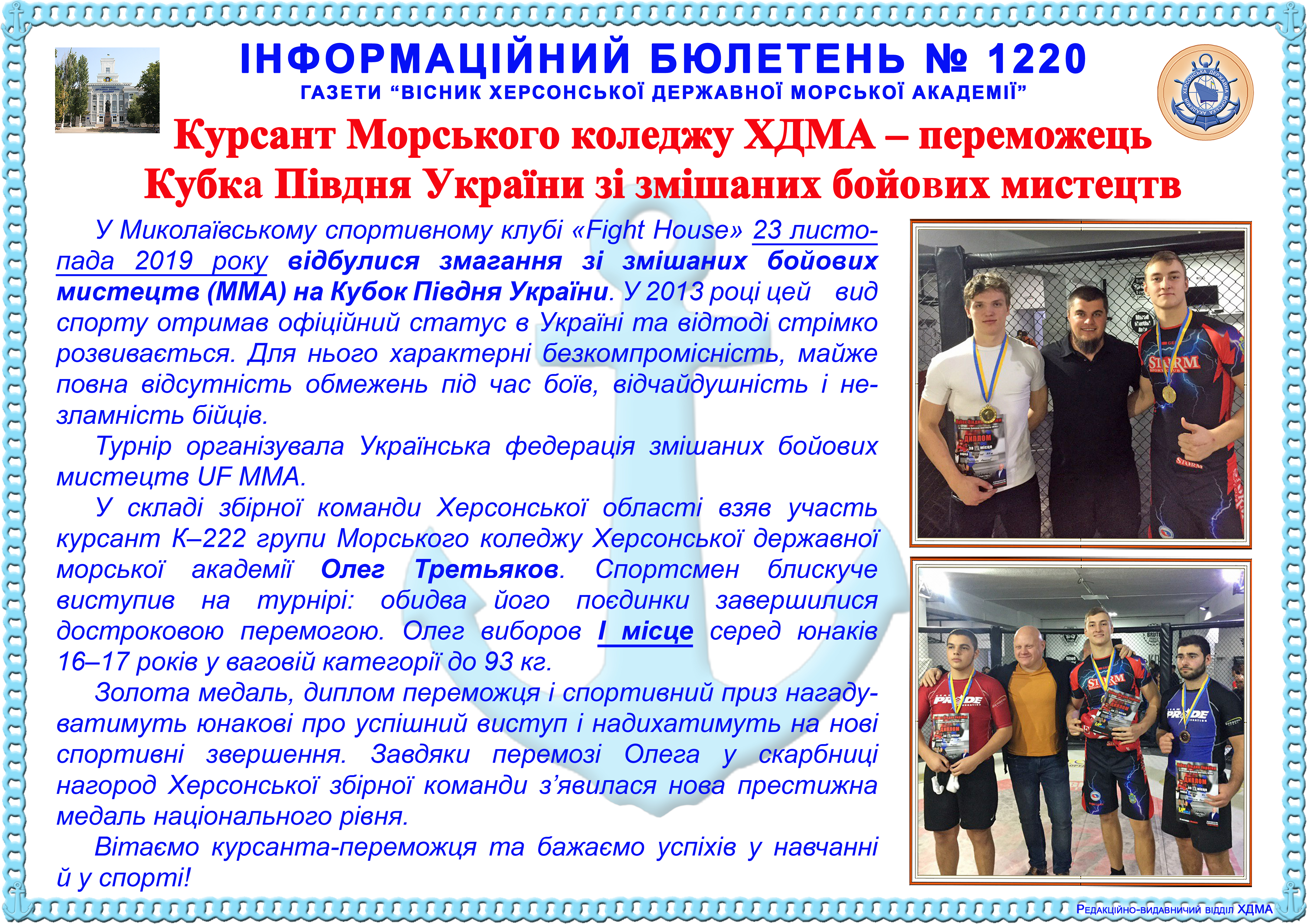 Інформаційний бюлетень № 1220 Курсант Морського коледжу ХДМА – переможець Кубка Півдня України зі змішаних бойових мистецтв