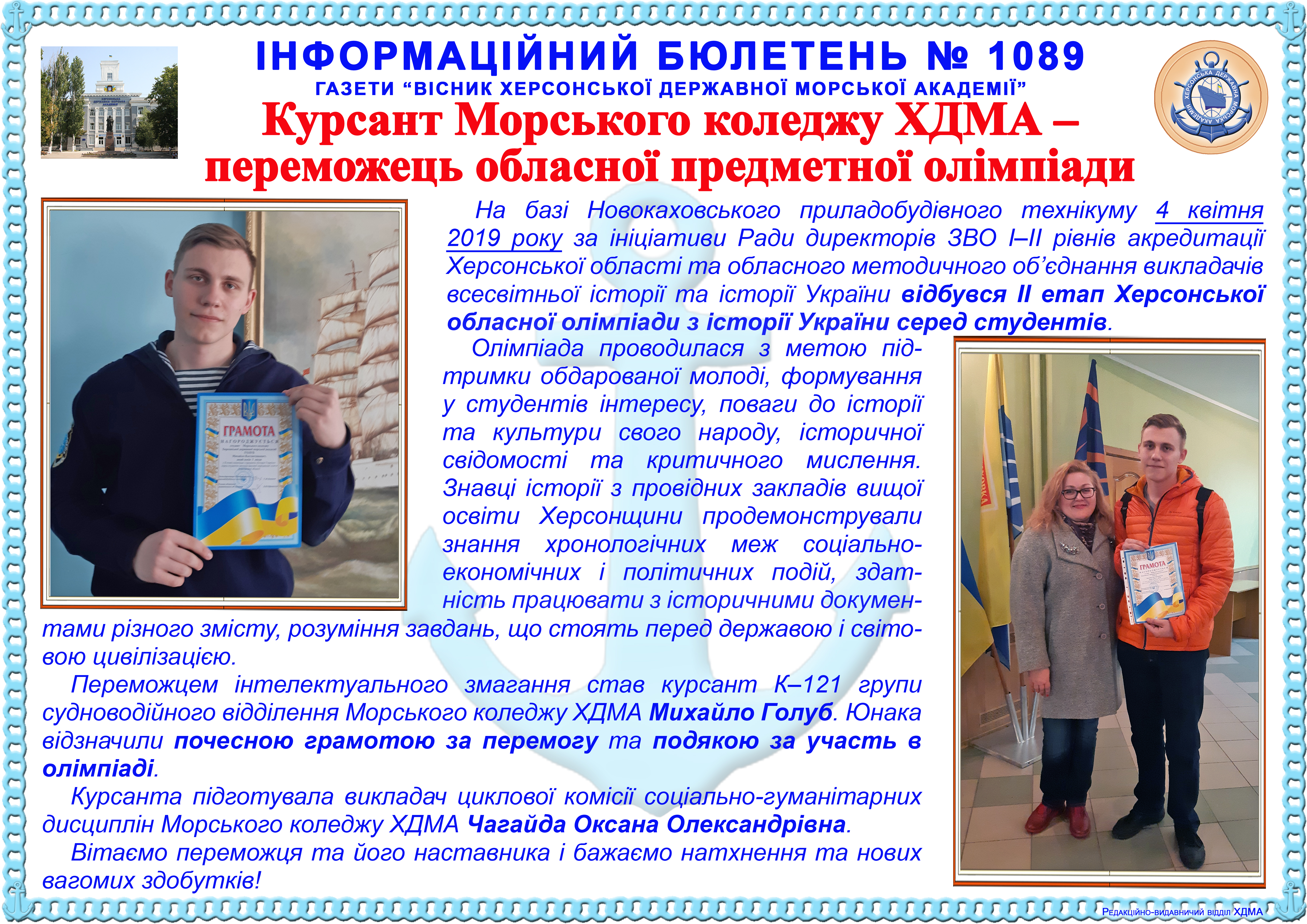 Інформаційний бюлетень № 1089 Курсант Морського коледжу ХДМА – переможець обласної предметної олімпіади