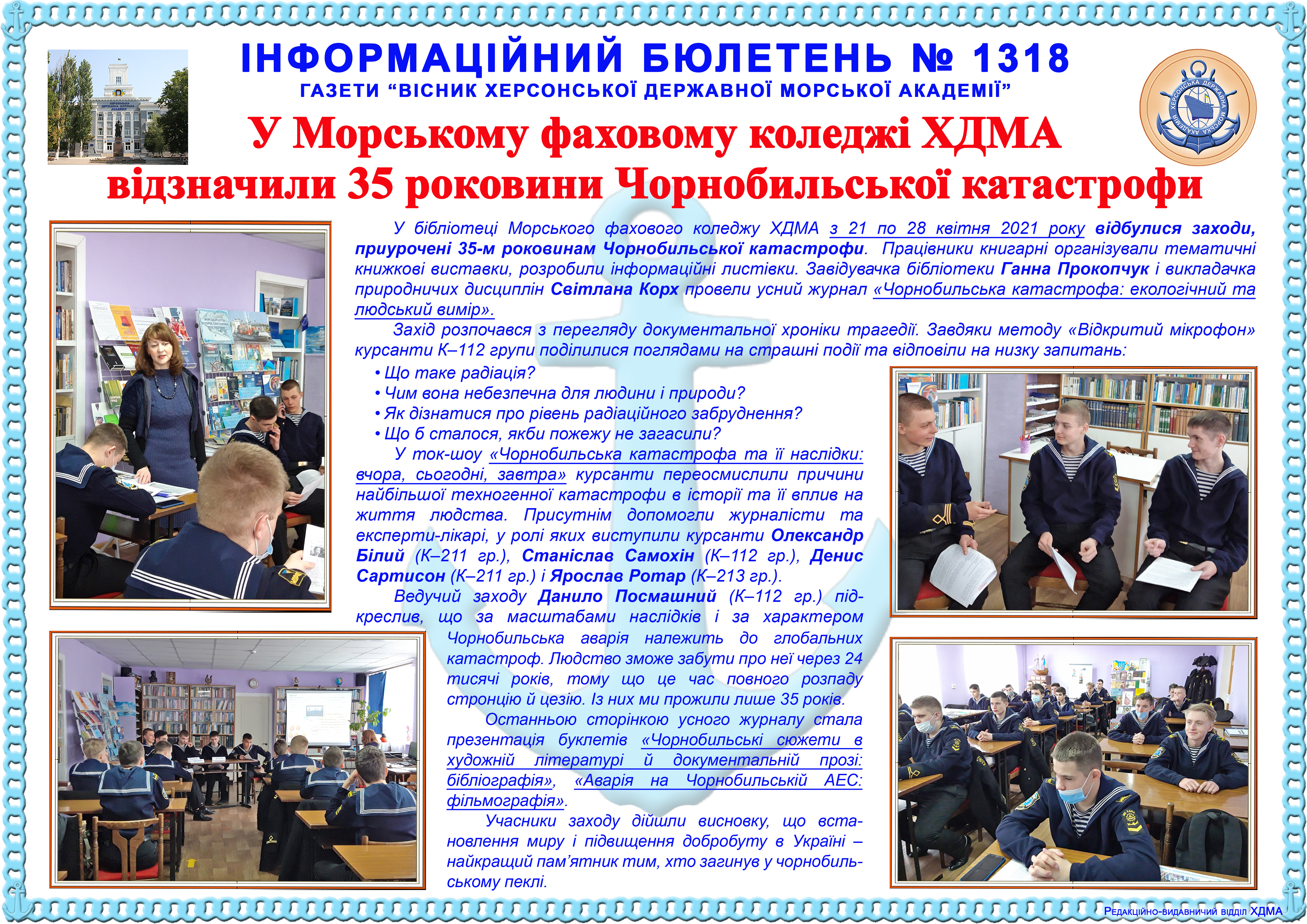 Інформаційний бюлетень №1318 У Морському фаховому коледжі ХДМА відзначили 35 роковини Чорнобильської катастрофи