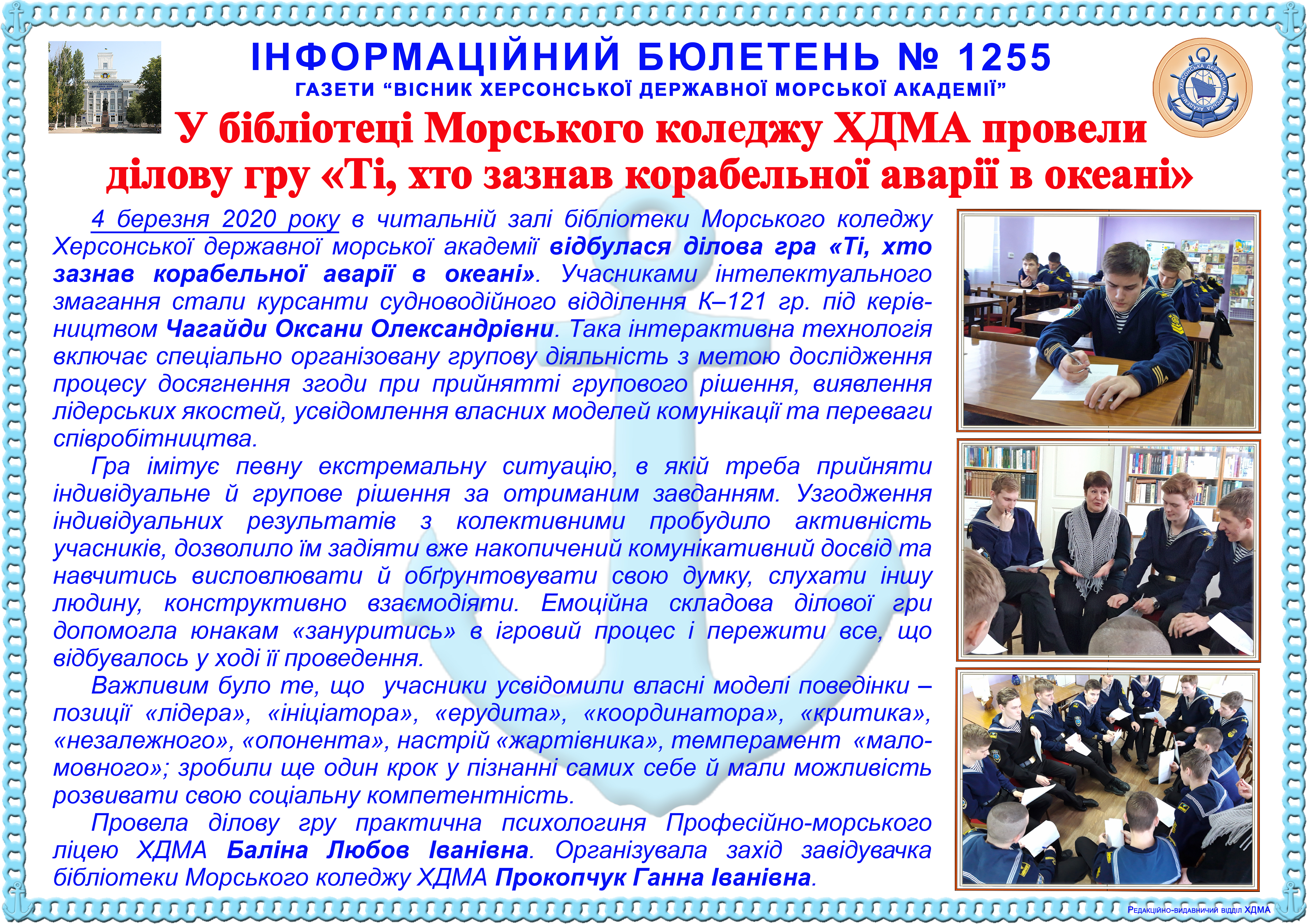 Інформаційний бюлетень № 1255 У бібліотеці Морського коледжу ХДМА провели ділову гру «Ті, хто зазнав корабельної аварії в океані»