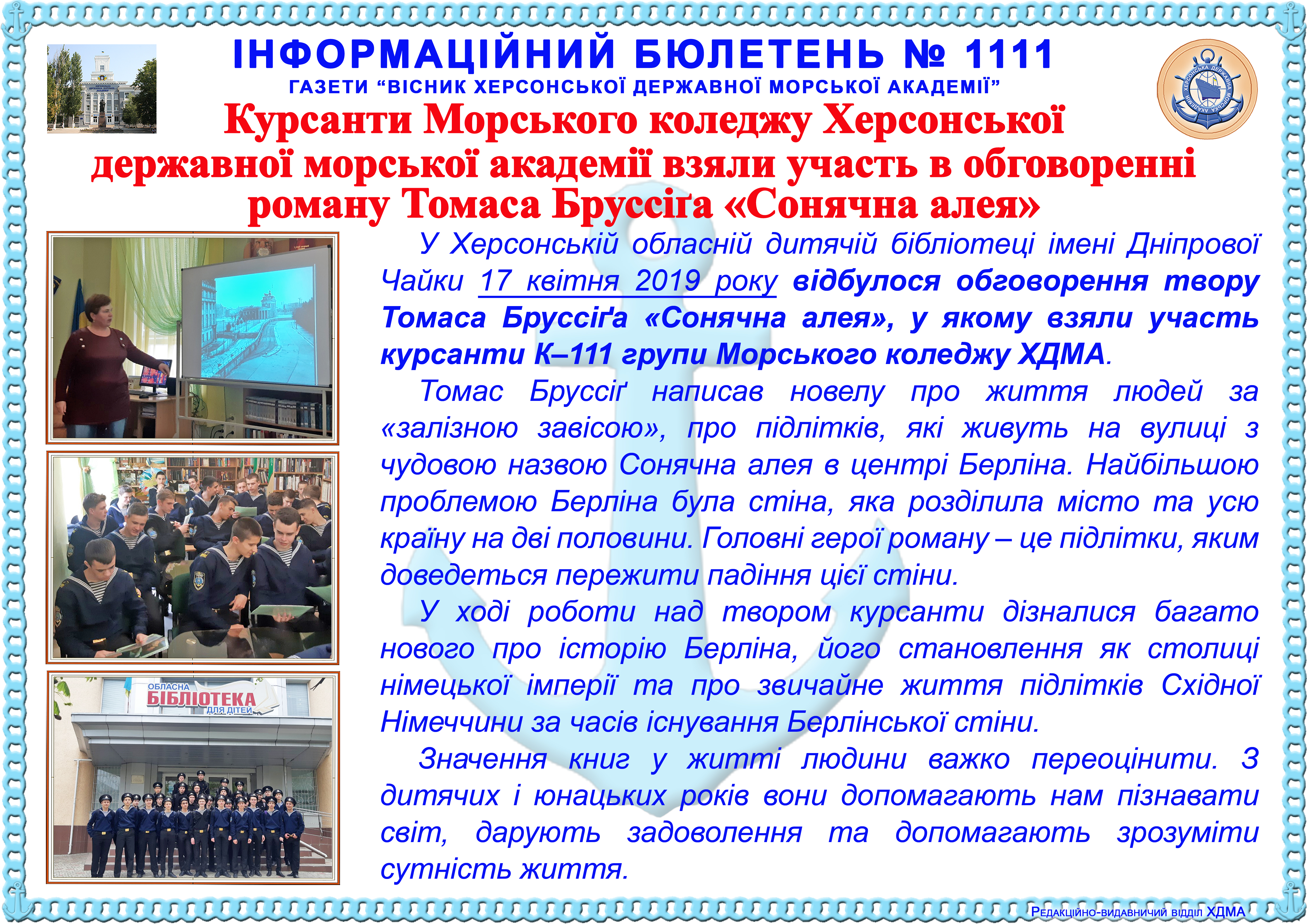 Інформаційний бюлетень № 1111 Курсанти Морського коледжу Херсонської державної морської академії взяли участь в обговоренні роману Томаса Бруссіґа «Сонячна алея»