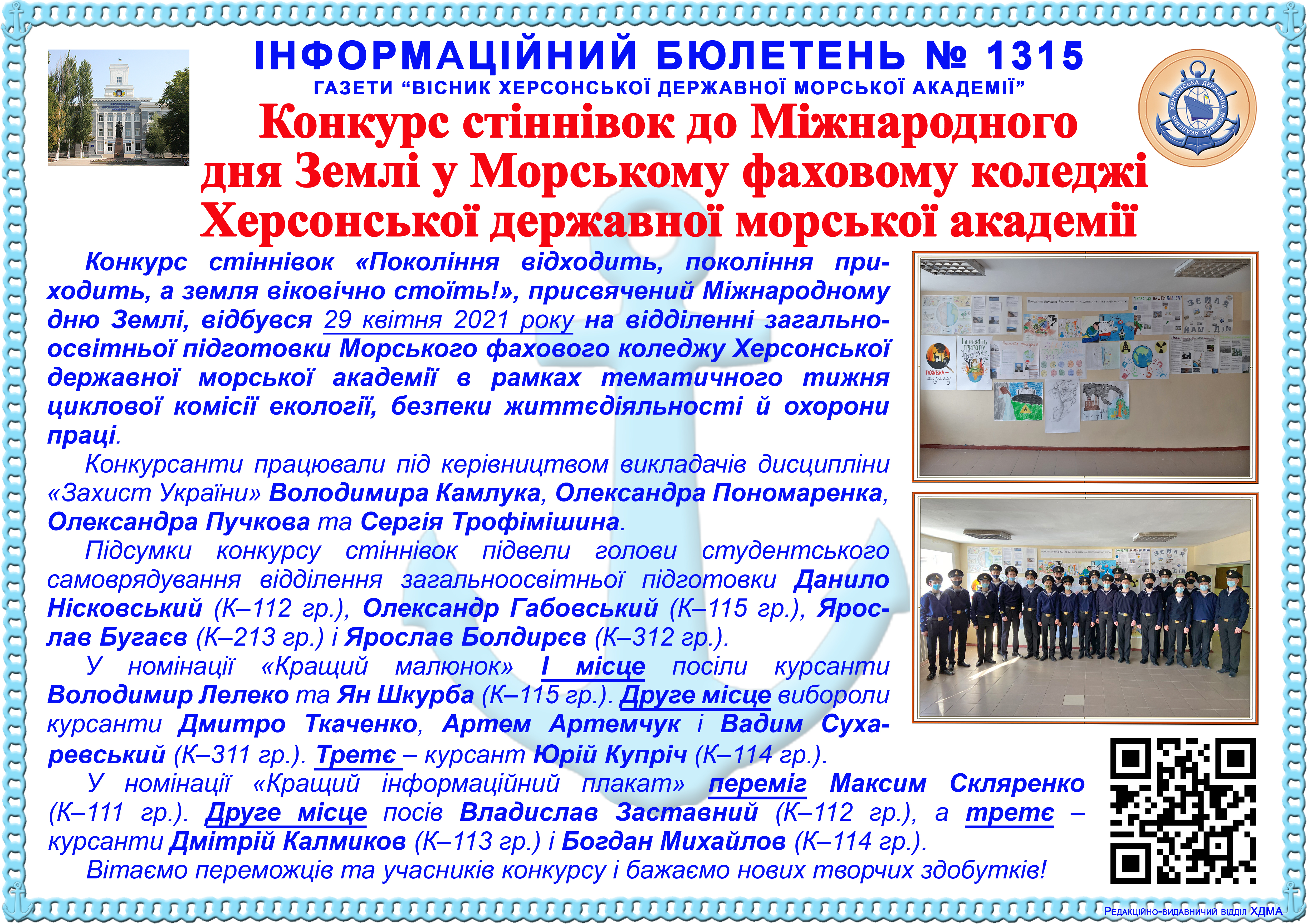 Інформаційний бюлетень № 1315 Конкурс стіннівок до Міжнародного дня Землі у Морському фаховому коледжі ХДМА