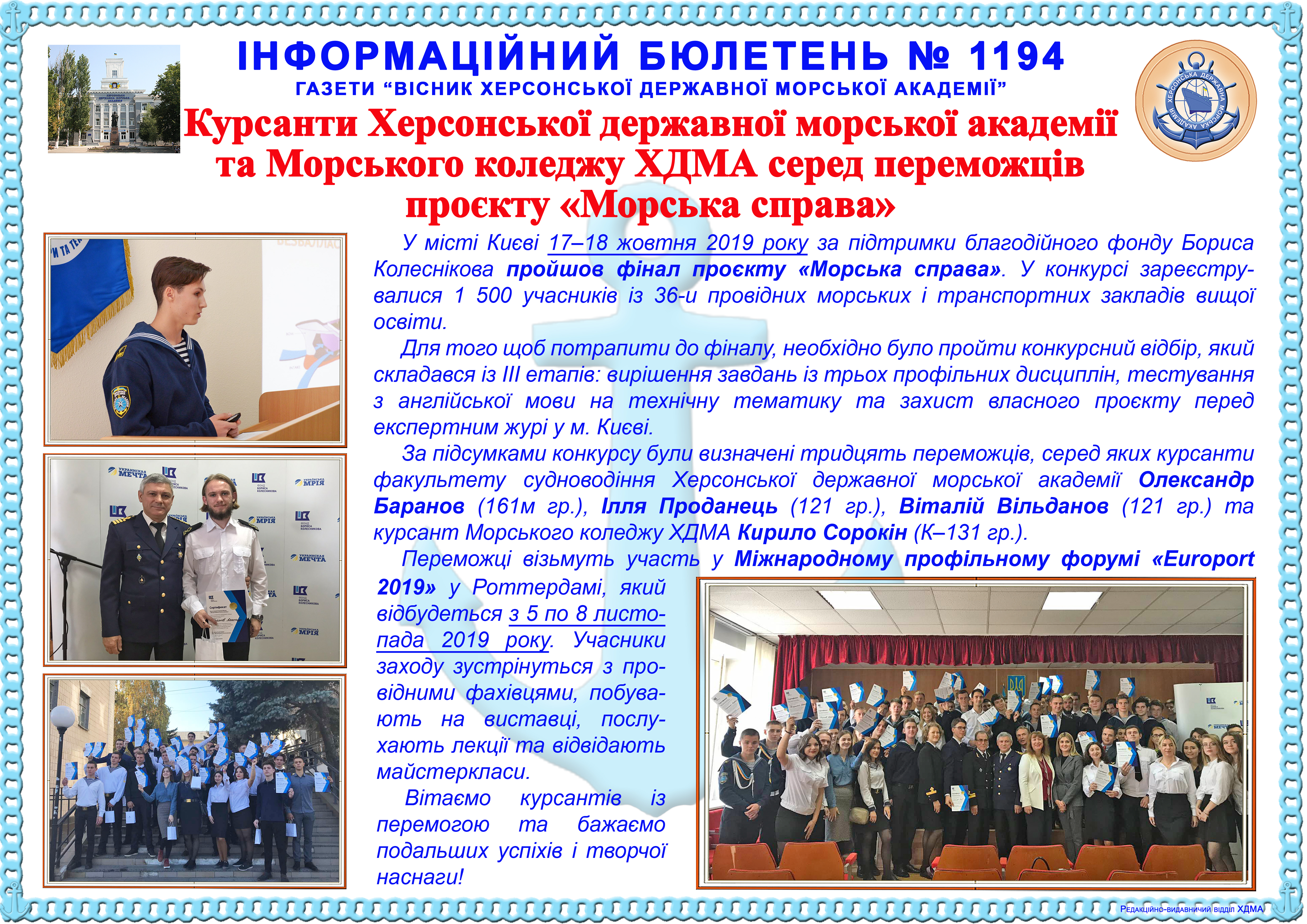 Інформаційний бюлетень № 1194 Курсанти Херсонської державної морської академії та Морського коледжу ХДМА серед переможців проєкту «Морська справа»