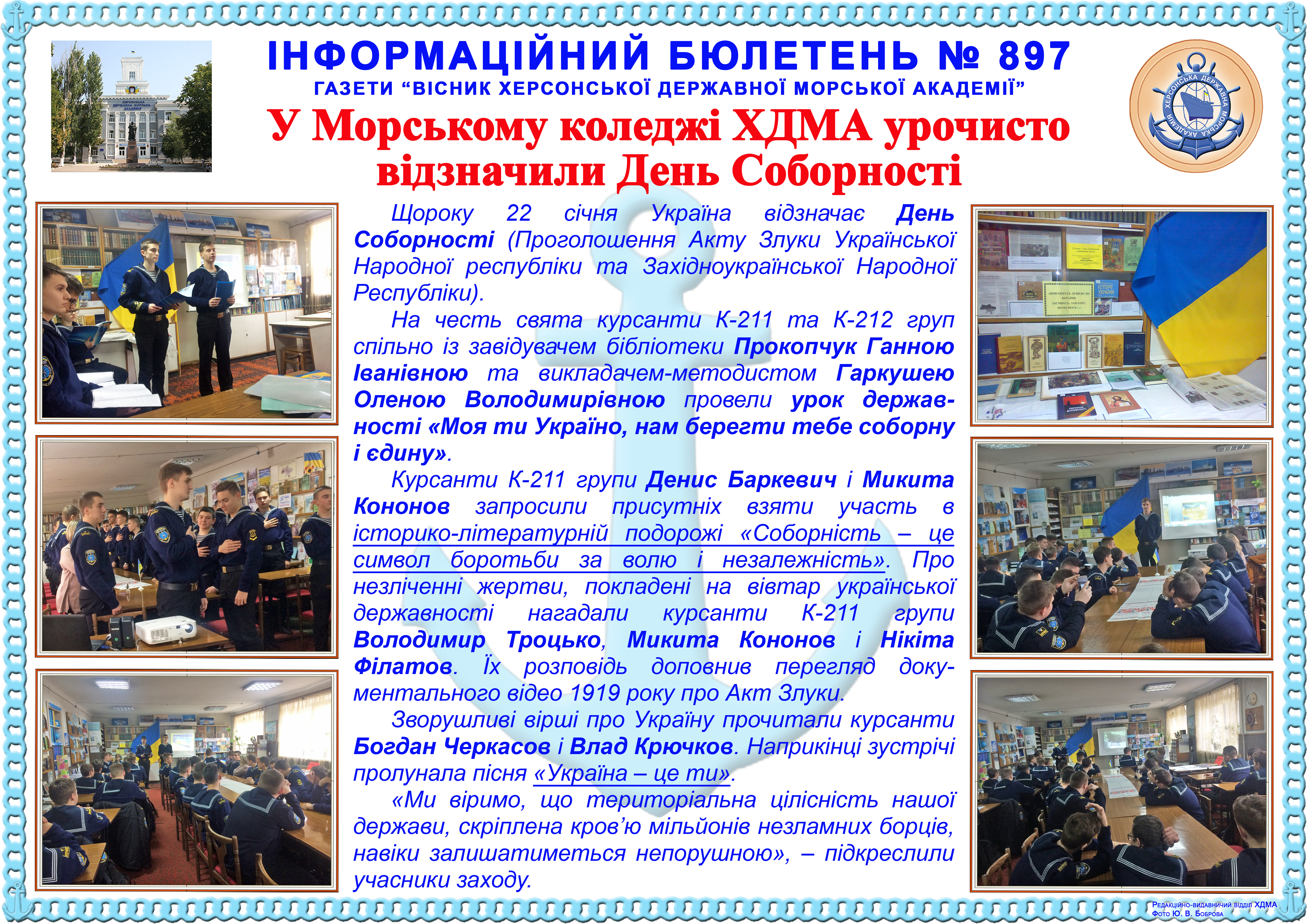 Інформаційний бюлетень № 897 У Морському коледжі ХДМА відзначили День Соборності