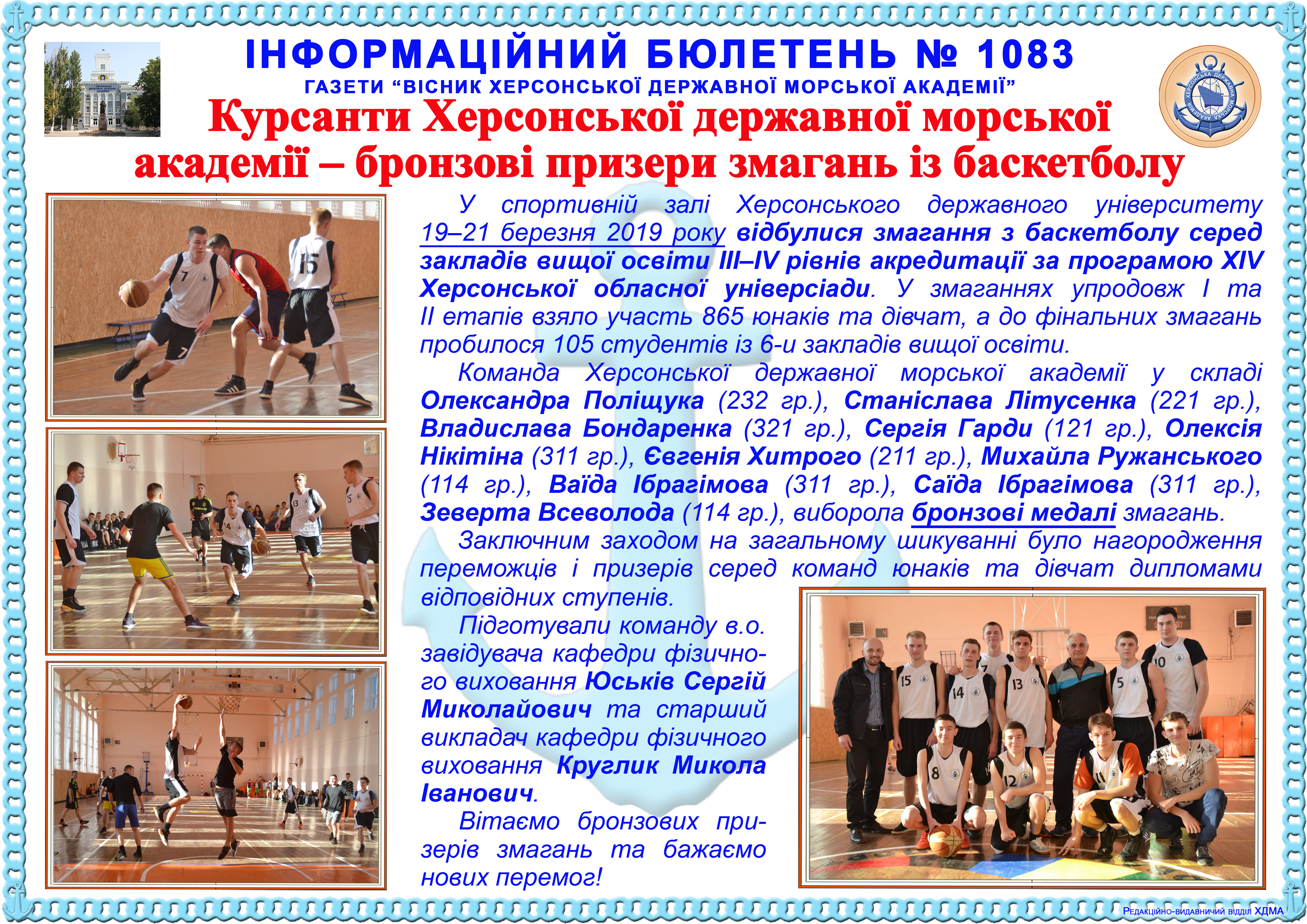 Інформаційний бюлетень № 1083 Курсанти Херсонської державної морської академії – бронзові призери змагань із баскетболу
