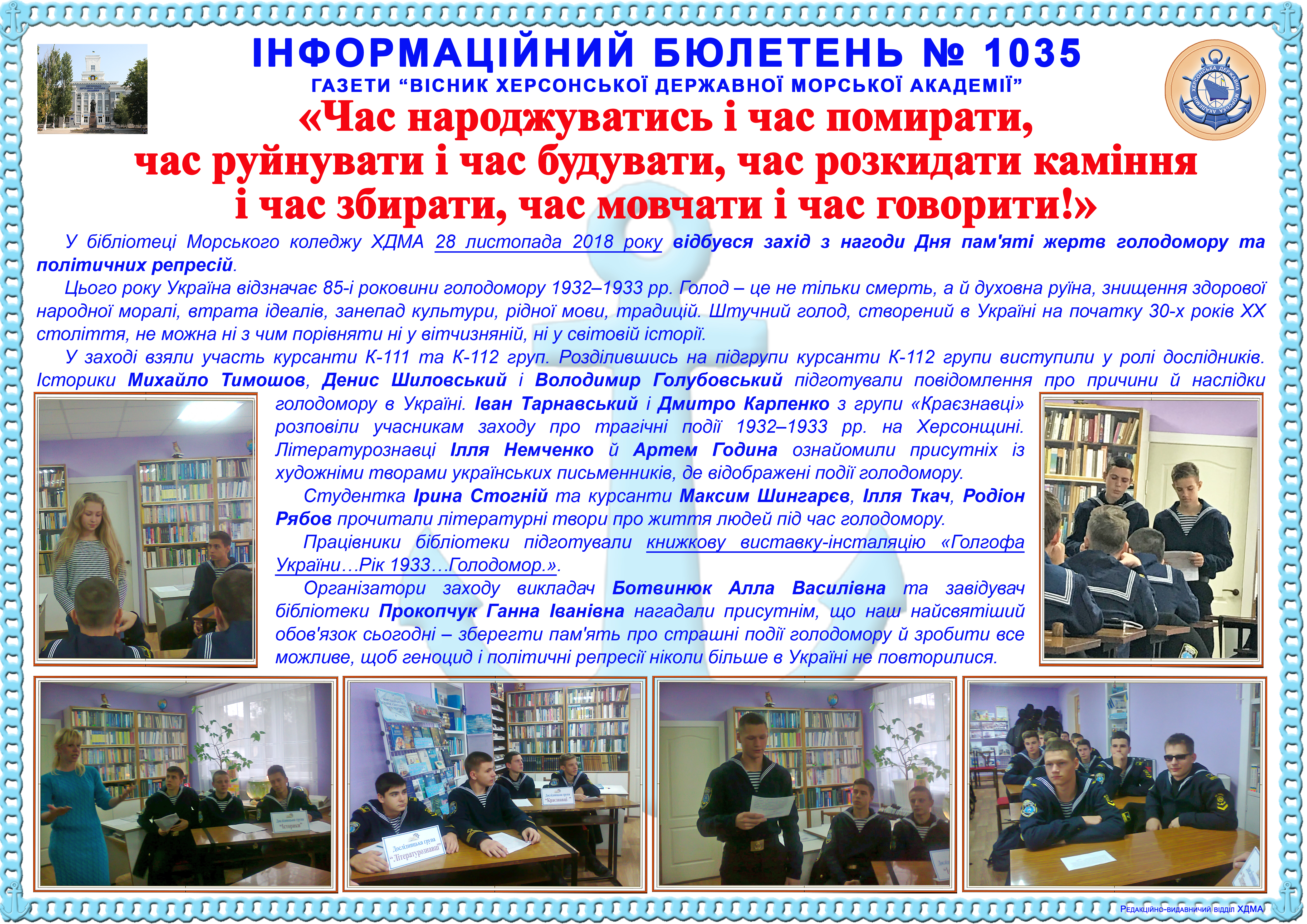 Інформаційний бюлетень № 1035 «Час народжуватись і час помирати, час руйнувати і час будувати, час розкидати каміння і час збирати, час мовчати і час говорити!»