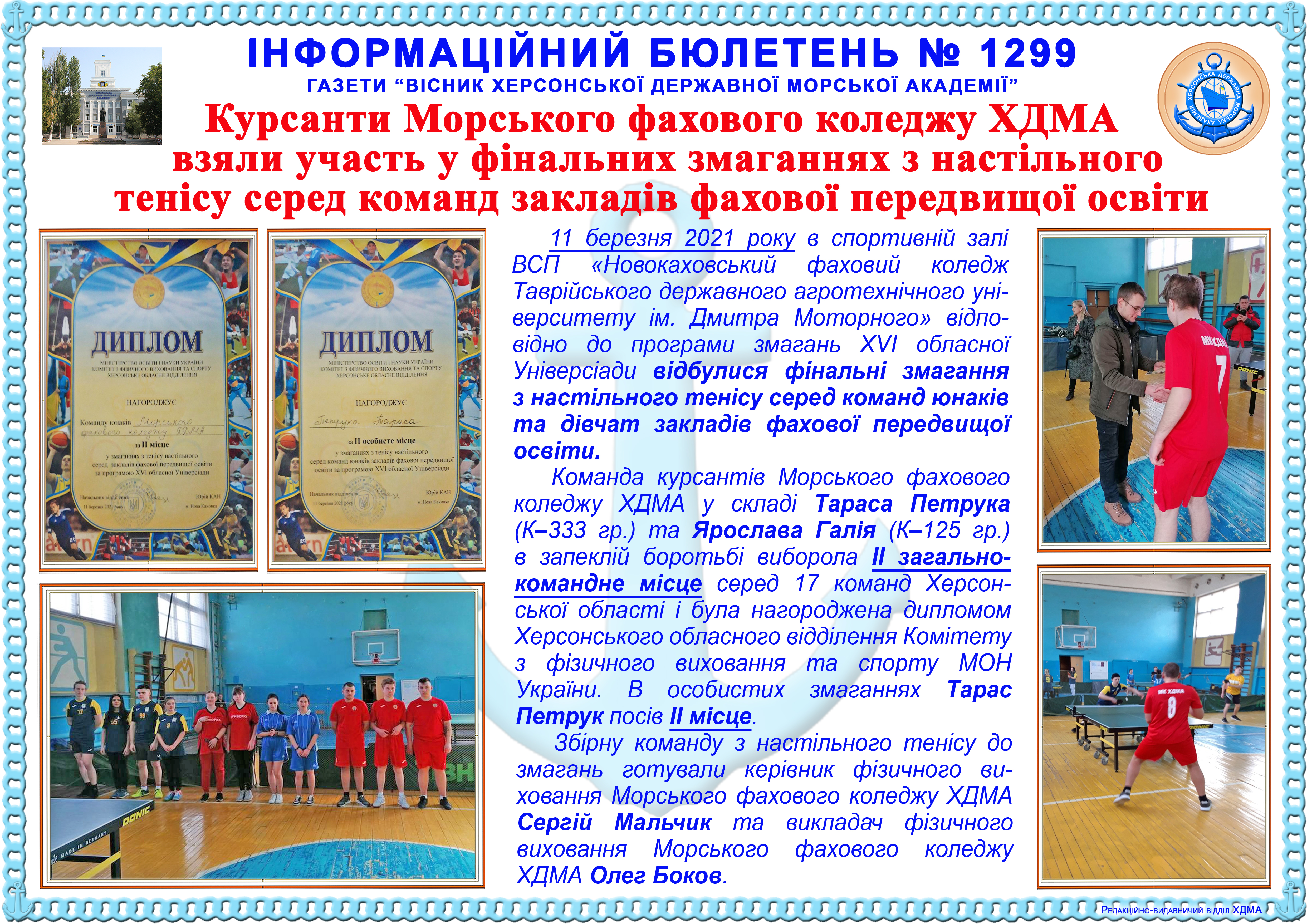 Інформаційний бюлетень № 1299 Курсанти Морського фахового коледжу ХДМА взяли участь у фінальних змаганнях з настільного тенісу серед команд закладів фахової передвищої освіти