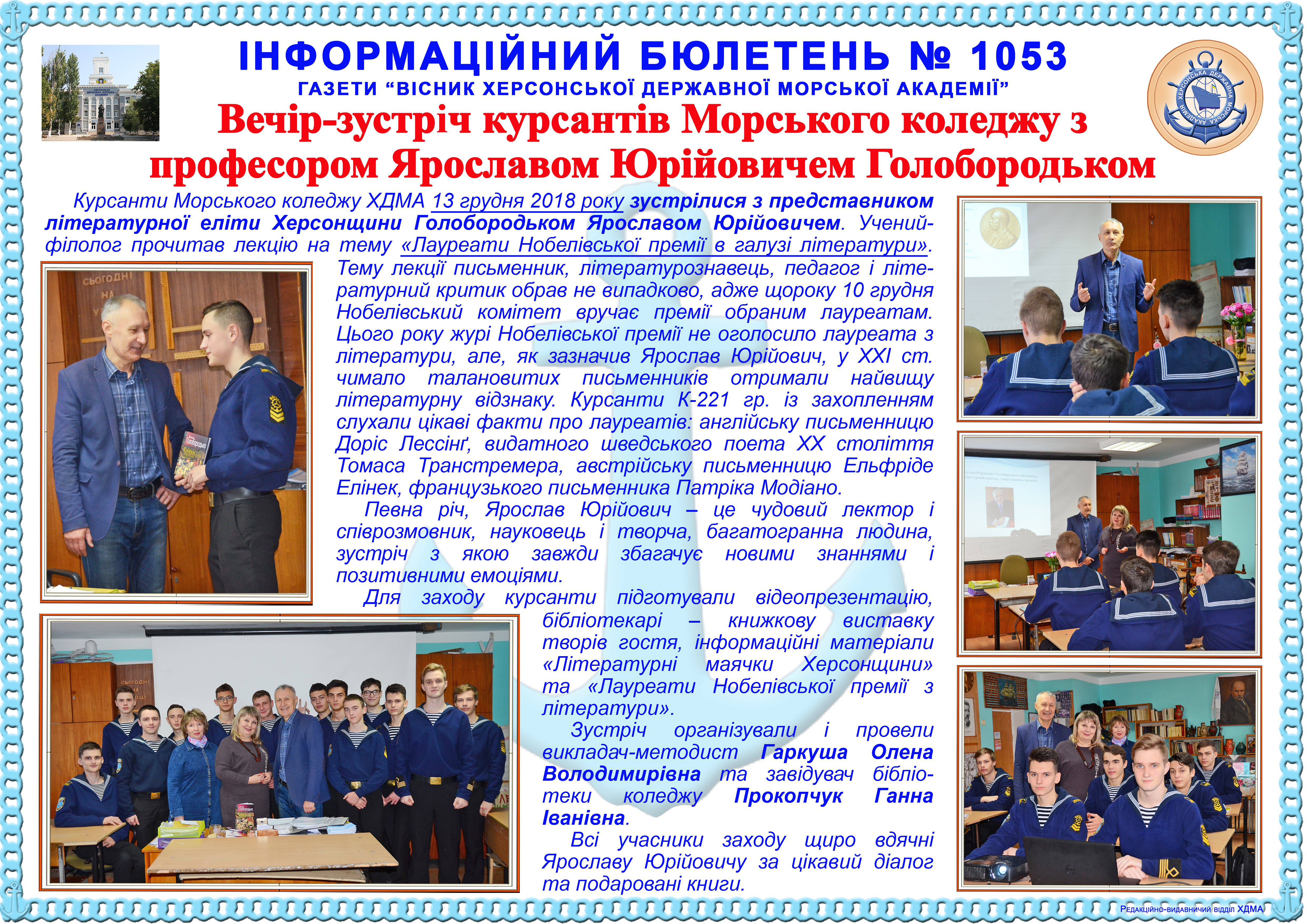 Інформаційний бюлетень № 1053 Вечір-зустріч курсантів Морського коледжу з професором Ярославом Юрійовичем Голобородьком